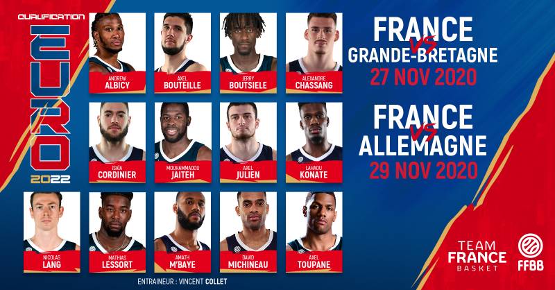 L’entraîneur de l’Équipe de France masculine, Vincent Collet et le Général Manager du Team France Basket, Patrick Beesley, ont communiqué ce vendredi 23 octobre, une liste de 13 joueurs convoqués pour le stage de préparation aux matches de qualification de l’EuroBasket 2022. La France jouera deux matches au Palais des Sports de Pau (64), face à la Grande-Bretagne, le vendredi 27 novembre et contre l’Allemagne le dimanche 29 novembre.