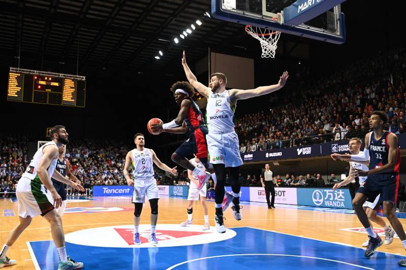 Bien assez de raisons pour tout donner une dernière fois. Mais l’enthousiasme, évident à l’échauffement, et l’adresse ne font pas toujours bon ménage et comme jeudi soir en République tchèque les hommes de Vincent Collet ont déjoué offensivement lors d’un premier quart-temps particulièrement poussif, conclu sur un 4/16 aux tirs et que seul un alley-oop stratosphérique de Victor Wembanyama venait égayer. Si leur défense leur permet, comme souvent, de voir venir, la domination totale des Lituaniens au rebond offensif (8 prises en dix minutes) leur donnait les deuxièmes chances nécessaires pour s’offrir quelques respirations (9-14) face à une pression déjà étouffante que le banc de touche allait accentuer.