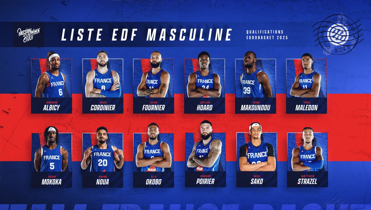 Alain Contensoux (Directeur Technique National), Jacky Commères (Directeur des Équipes de France et de la performance), Frédéric Fauthoux (entraîneur de l’Équipe de France masculine) et Boris Diaw (Général Manager du Team France Basket) ont dévoilé ce vendredi 17 janvier la liste des douze Bleus retenus pour les deux dernières rencontres de qualifications à l’EuroBasket 2025, face à la Croatie puis la Bosnie-Herzégovine.