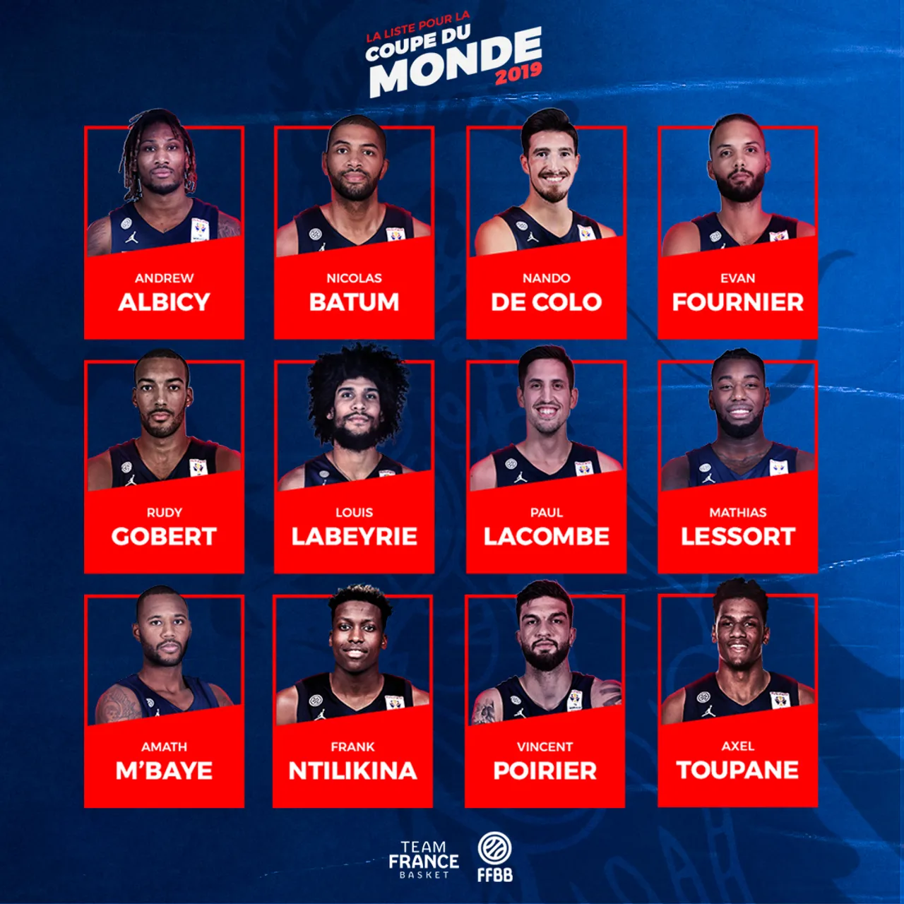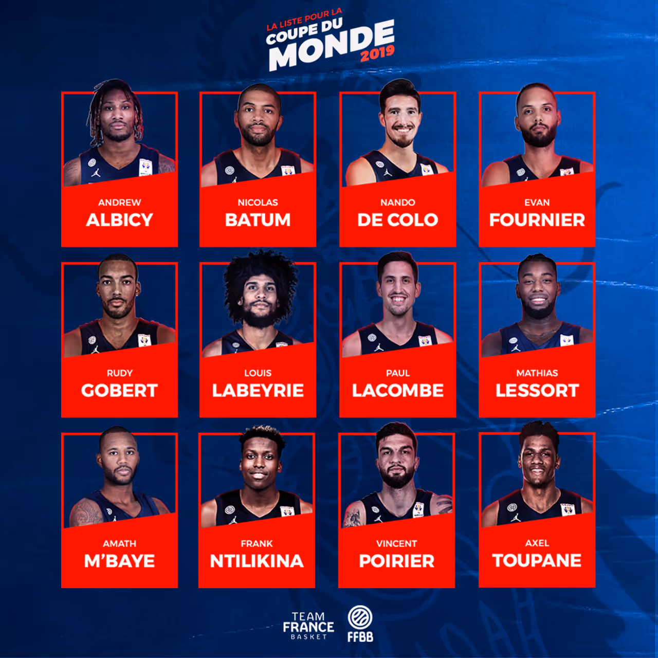L’entraîneur de l’Équipe de France masculine de basket, Vincent Collet, a annoncé, ce mardi 27 août, à Shenyang (Chine), les noms des 12 joueurs qui participeront à la Coupe du Monde 2019. Les meneurs Théo MALEDON (1,91 m, 18 ans, 5 sélections) et Elie OKOBO (1,90 m, 21 ans, 8 sélections) sont les derniers joueurs non retenus pour la Coupe du Monde.
