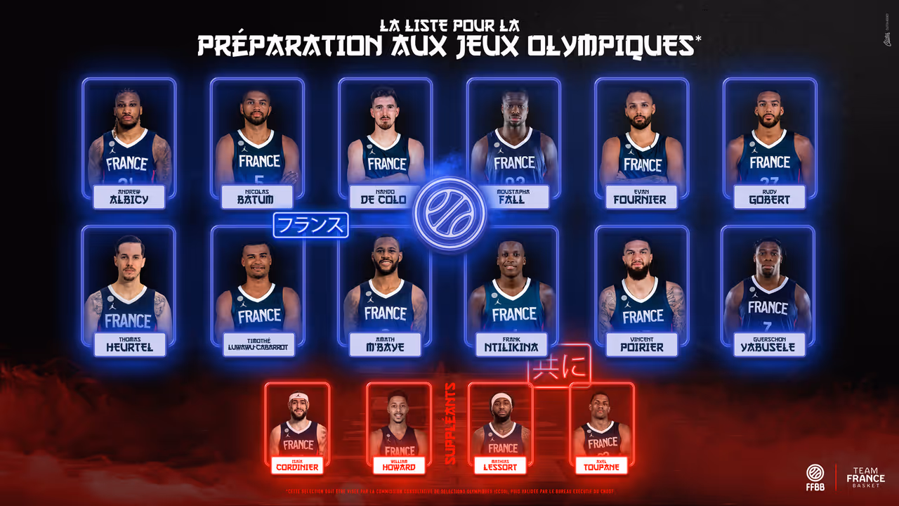 Regroupés le 23 juin prochain, les Bleus joueront cinq rencontres de préparation avant les Jeux Olympiques, dont une double confrontation face à l'Espagne (le 8 juillet à Malaga et le 10 juillet à l'Accor Arena de Paris).