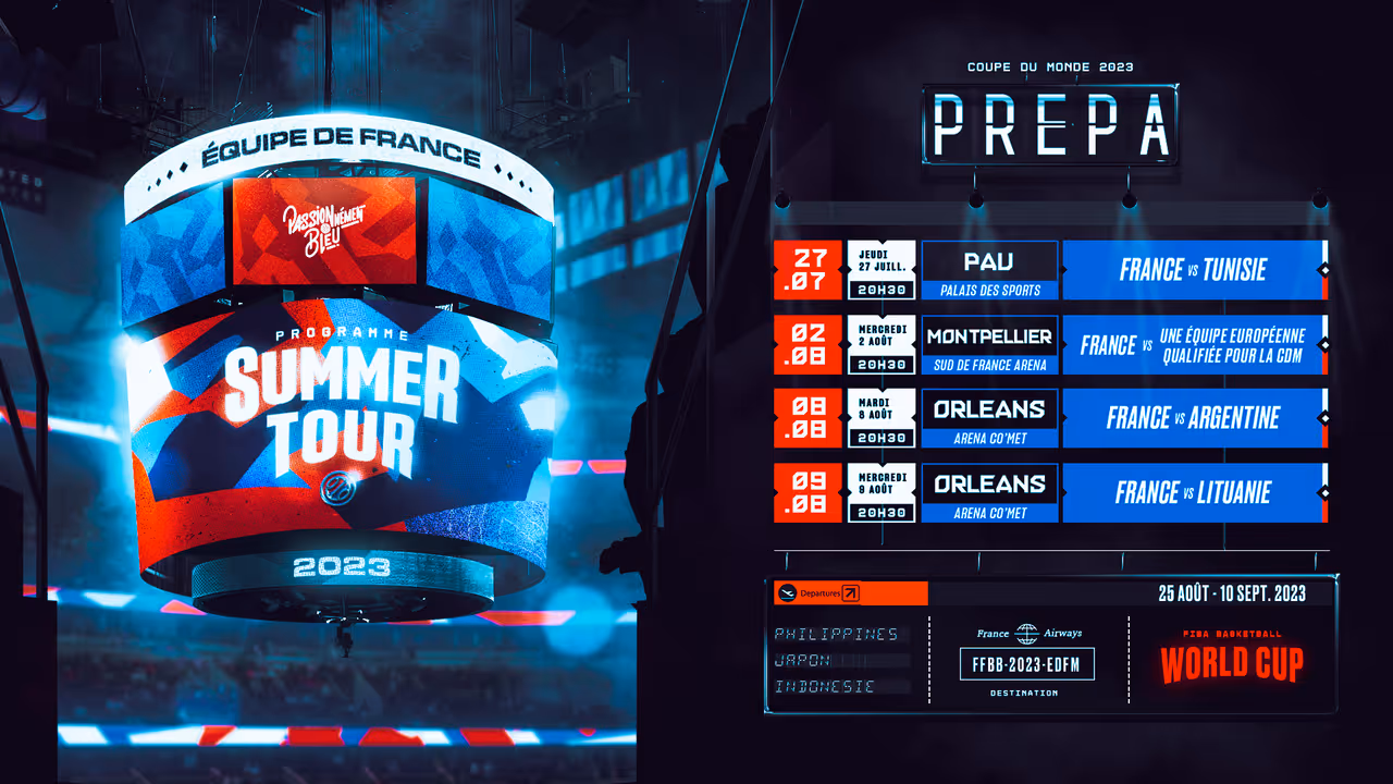 Les Bleus seront réunis en stage à partir du lundi 24 juillet à Pau. Après un premier match face à la Tunisie le jeudi 27 juillet au Palais des Sports (7 200 spectateurs), les Tricolores se rendront à la Sud de France Arena de Montpellier (8 500 spectateurs) pour y affronter, le mercredi 2 août, le Monténégro. Les joueurs de Vincent Collet termineront leur préparation, en France, par deux rencontres (Lundi 7 et mercredi 9 août) face au Vénézuéla puis la Lituanie à la Co’Met Arena d’Orléans. Inaugurée en janvier, la nouvelle salle de 10 000 places, promet une très belle expérience. Les Français se rendront ensuite en Lituanie pour jouer leur 5e rencontre de préparation, le vendredi 11 août. L’Équipe de France s’envolera ensuite vers l’Asie, le lundi 14 août, afin de disputer un dernier tournoi de préparation (lieu à déterminer), avant la Coupe du Monde.