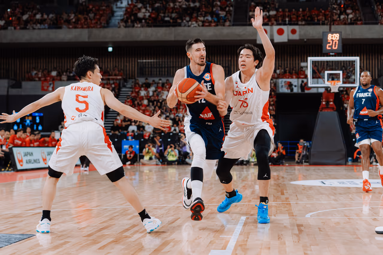 L’Ariake Arena a fait salle comble pour accueillir l’Équipe de France. Dans un pays épris de NBA, les Bleus font recette et les fans locaux ont ainsi pu se consoler de l’absence de la star Yuta Watanabe, en se concentrant sur Evan Fournier et Rudy Gobert, les premiers en action jeudi. Le pivot des Wolves n’a, face à ce type d’équipe, aucun joueur capable de le contenir près du cercle et au rebond. Il a copieusement dominé le premier quart-temps (8 points 3 rebonds et 2 passes) mais après quelques minutes d’un arrosage en règle sans réussite (1/7 à trois-points pour commencer), les Japonais ont commencé à régler la mire et imposé leur rythme. Un basket rapide, agressif et enthousiasmant, fait de créativité et de prise d’initiatives bien que reposant principalement sur le tir extérieur pour compenser un évident déficit athlétique.